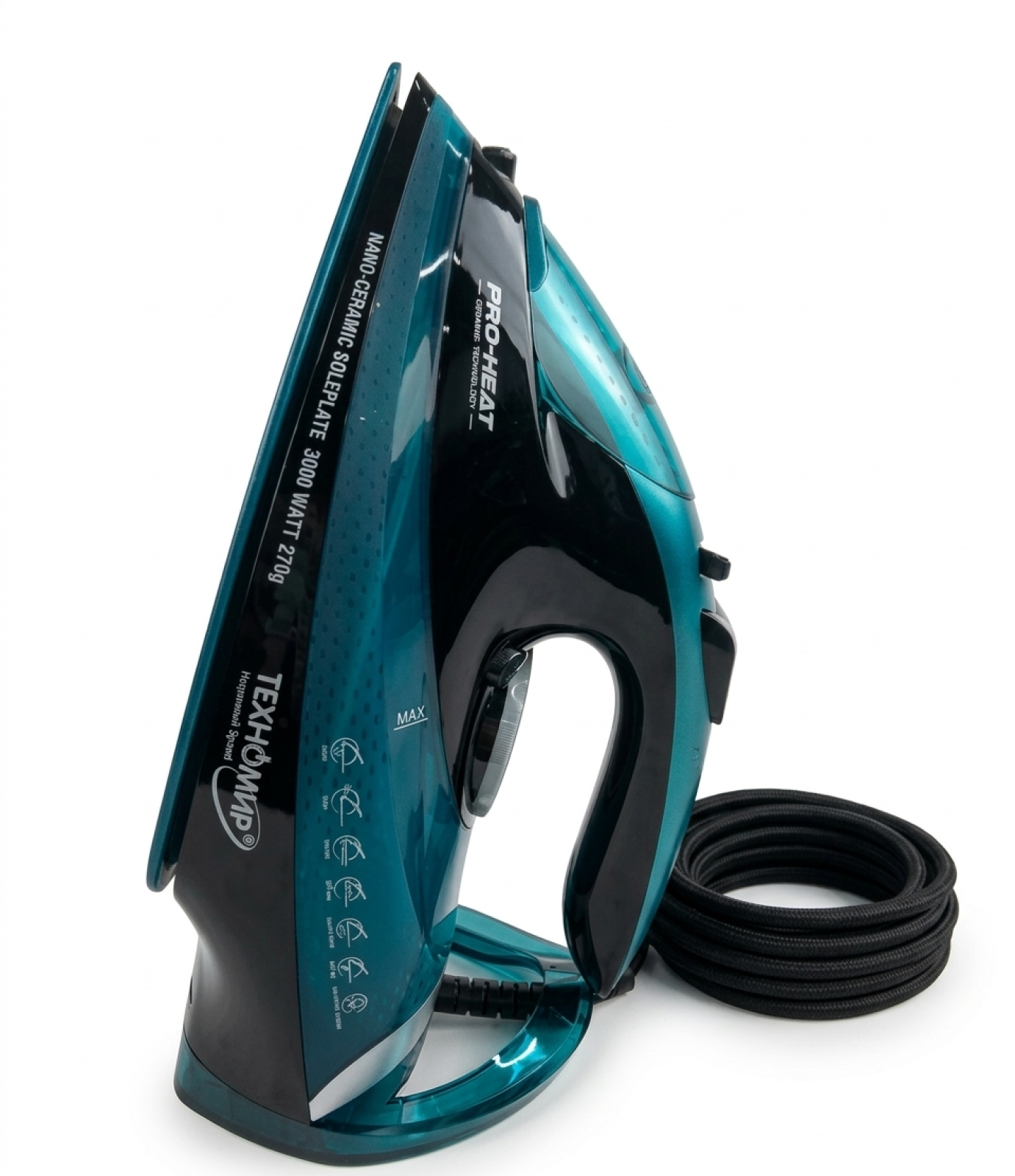Нанокерамическая подошва гарантирует идеальное скольжение по тканям, предотвращает прилипание и повреждение одежды, а также облегчает работу с деликатными материалами.