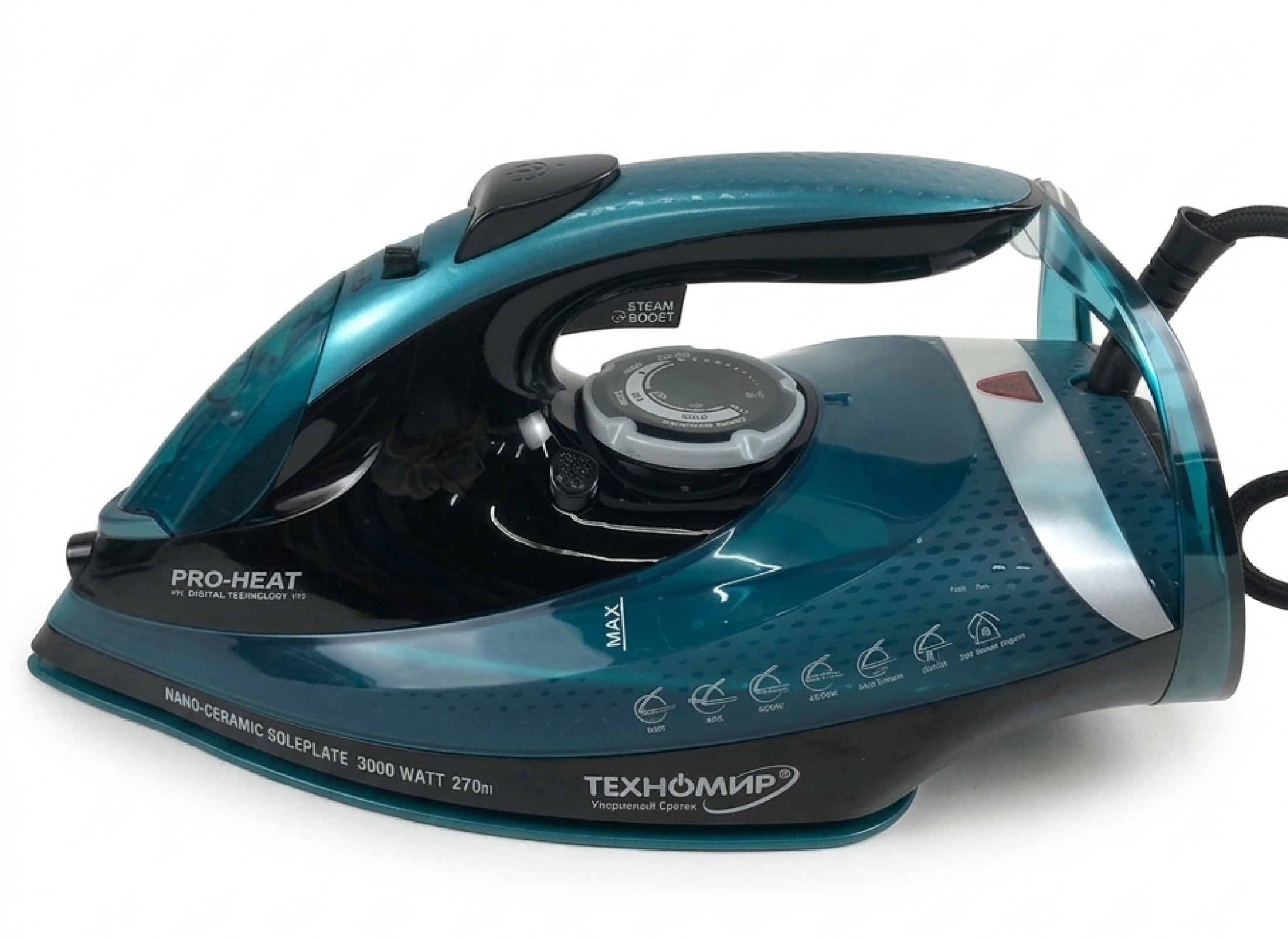 Стильный бирюзовый корпус утюга делает устройство привлекательным и современным. Эргономичная ручка и продуманная конструкция обеспечивают комфортное использование даже при длительной глажке.