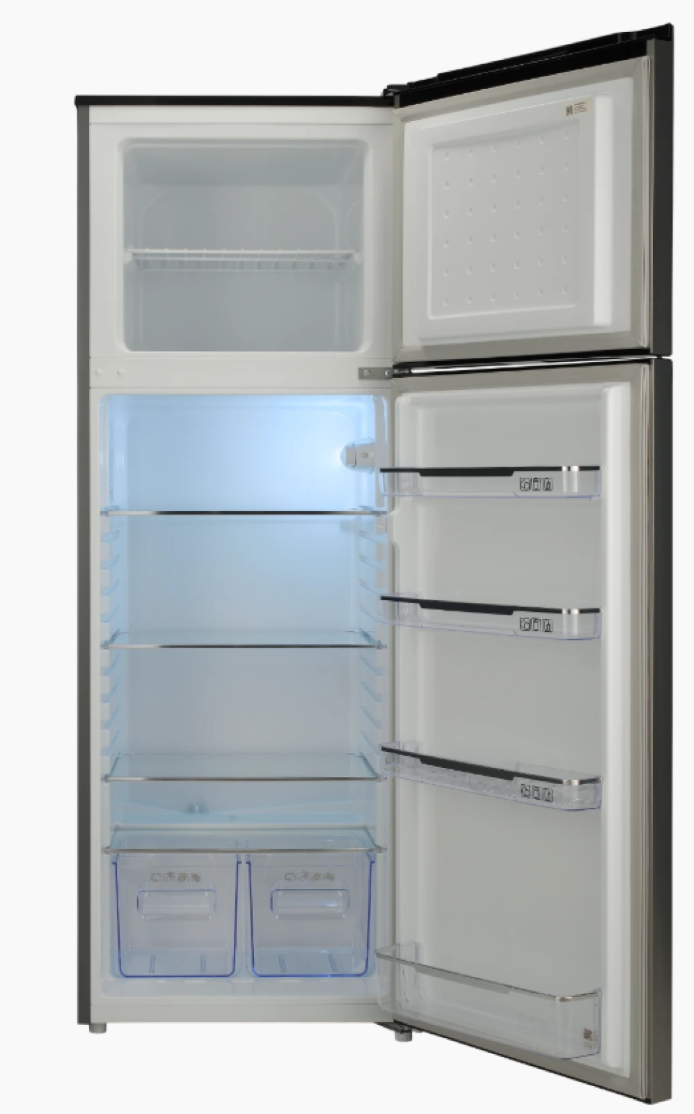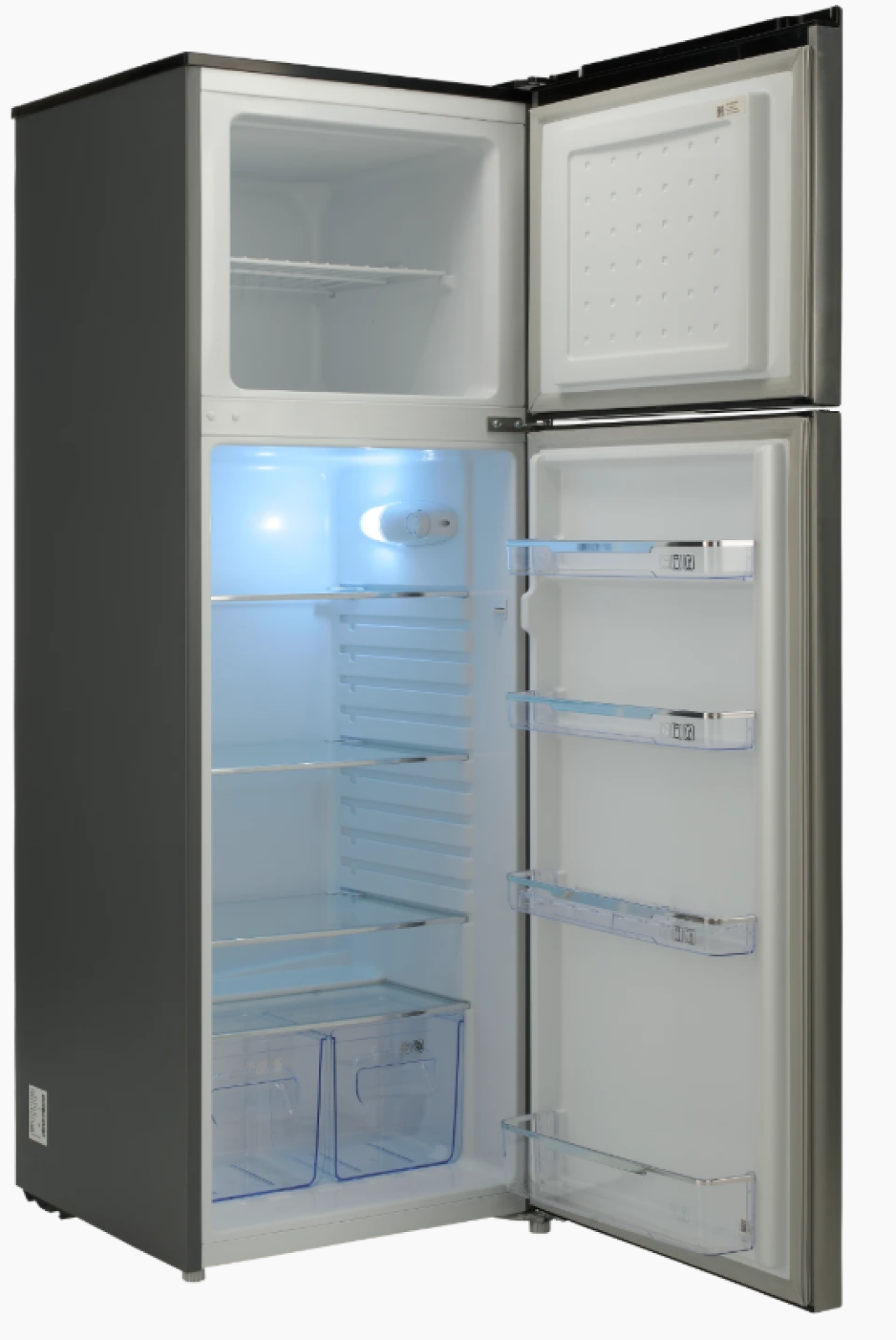 Объём холодильной камеры составляет примерно 286 л, что обеспечивает просторное пространство для хранения основных продуктов, напитков и крупногабаритных упаковок. Внутри расположены полки из закалённого стекла, устойчивые к нагрузкам и удобные для очистки. На дверце предусмотрены барьер‑полки, которые удобно использовать для бутылок, соусов и мелких продуктов. Также имеется ящик для фруктов и овощей, который помогает поддерживать их свежесть. Система размораживания холодильной камеры — капельная, что облегчает уход и предотвращает образование лишнего льда.