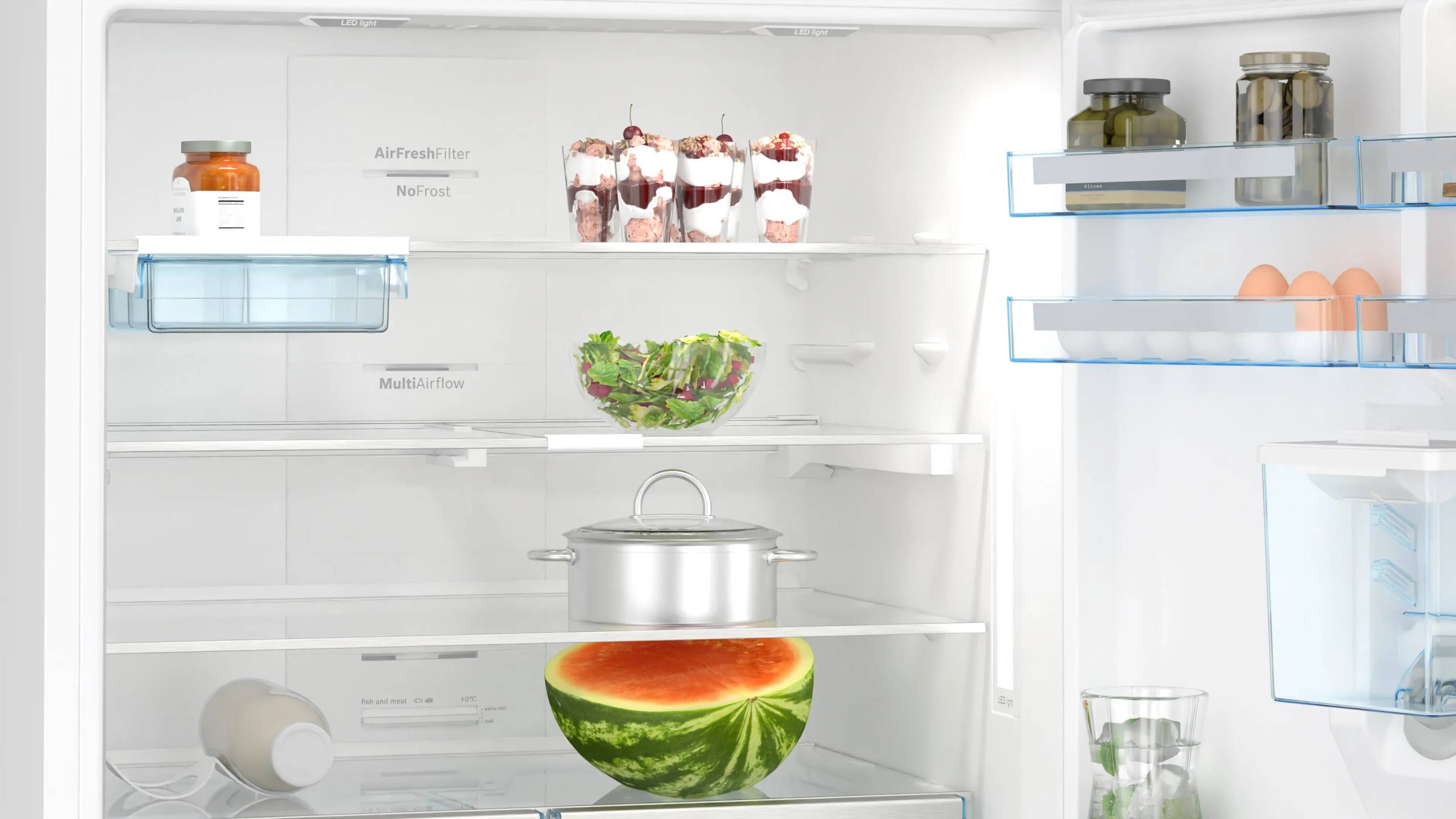 Система No Frost в холодильной и морозильной камерах поддерживает равномерное распределение холодного воздуха и полностью избавляет от необходимости ручной разморозки. Функция суперохлаждения быстро снижает температуру при загрузке большого количества продуктов, а режим SuperFreezing обеспечивает интенсивную заморозку без повышения температуры уже хранящихся запасов. Морозильная камера способна замораживать до 20 кг продуктов в сутки и сохраняет холод до 30 часов при отключении электроэнергии.