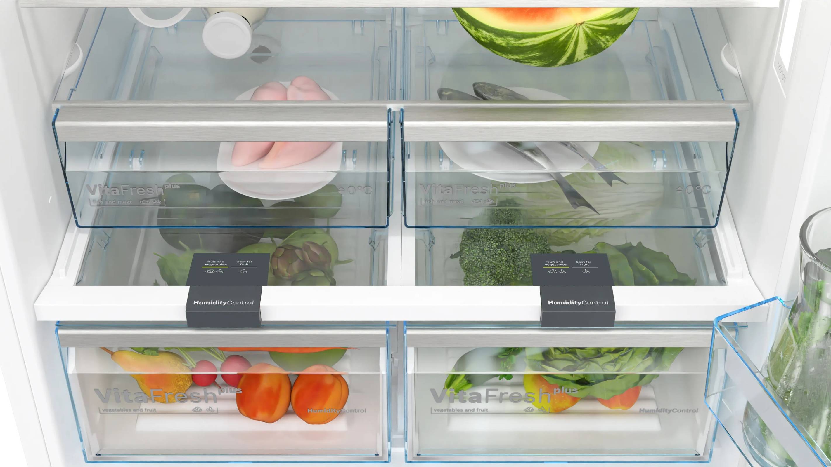 Система No Frost в обеих камерах обеспечивает равномерное распределение холодного воздуха и полностью исключает образование инея. Благодаря технологии MultiAirflow температура стабильно поддерживается на всех уровнях, независимо от заполненности холодильника. Функции суперохлаждения и SuperFreezing позволяют быстро охладить или заморозить большие объемы продуктов без вреда для уже хранящихся. Морозильная камера с двумя ящиками, включая вместительный BigBox, рассчитана на замораживание до 20 кг в сутки и способна сохранять холод до 30 часов при отключении электроэнергии.