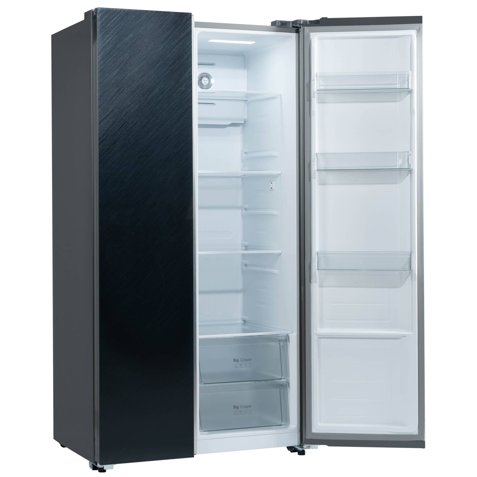 Side-by-Side холодильник Бирюса SBS 541 TBG (541 л) с дверьми из текстурированного чёрного стекла — элегантный и вместительный выбор для большой семьи: общий объём 541 л, Full No Frost в обеих камерах (без разморозки), Dual Inverter (инверторные компрессор и вентилятор для тишины и экономии энергии), система Multi Air Flow (равномерное распределение холода), деодорирующий фильтр Nano Ag+ (удаляет запахи и бактерии), зона свежести, электронное управление с LED-дисплеем, LED-освещение, режимы суперзаморозки/суперохлаждения.