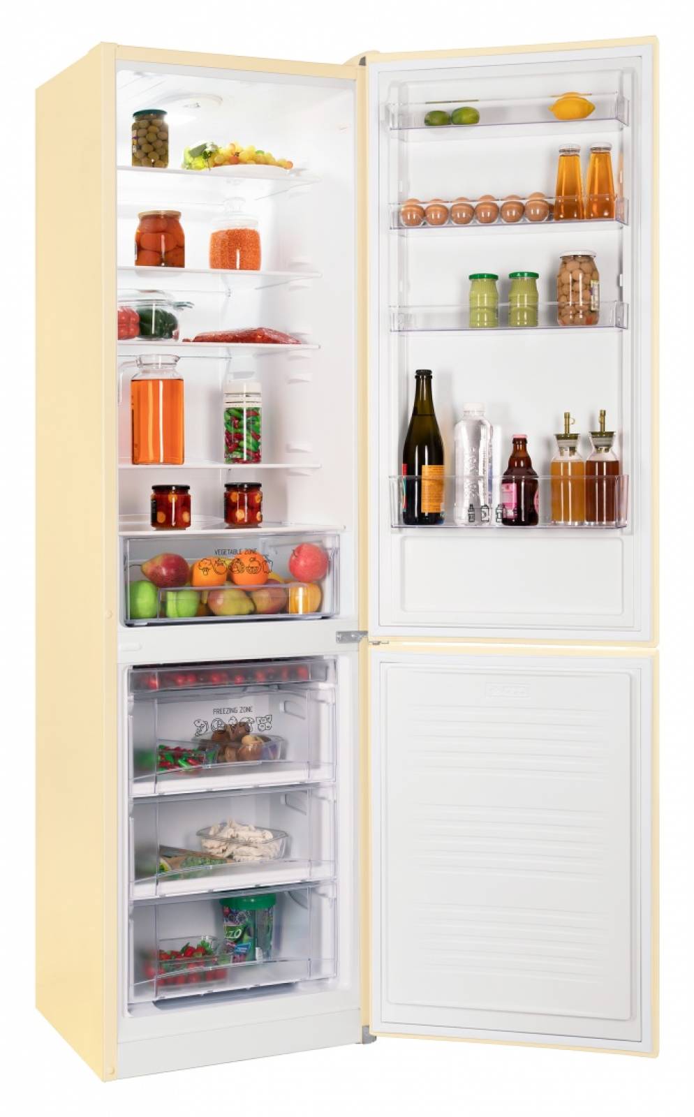 Объем отделения составляет 105 л. Для размещения продуктов предусмотрено три ящика из прозрачного, прочного пластика, два из которых имеют увеличенные размеры, а также лоток для замораживания ягод. Мощность заморозки в сутки составляет до 3,5 кг. Благодаря системе No Frost, на стенках не образовывается иней и наледь, что избавит от необходимости размораживания вручную.