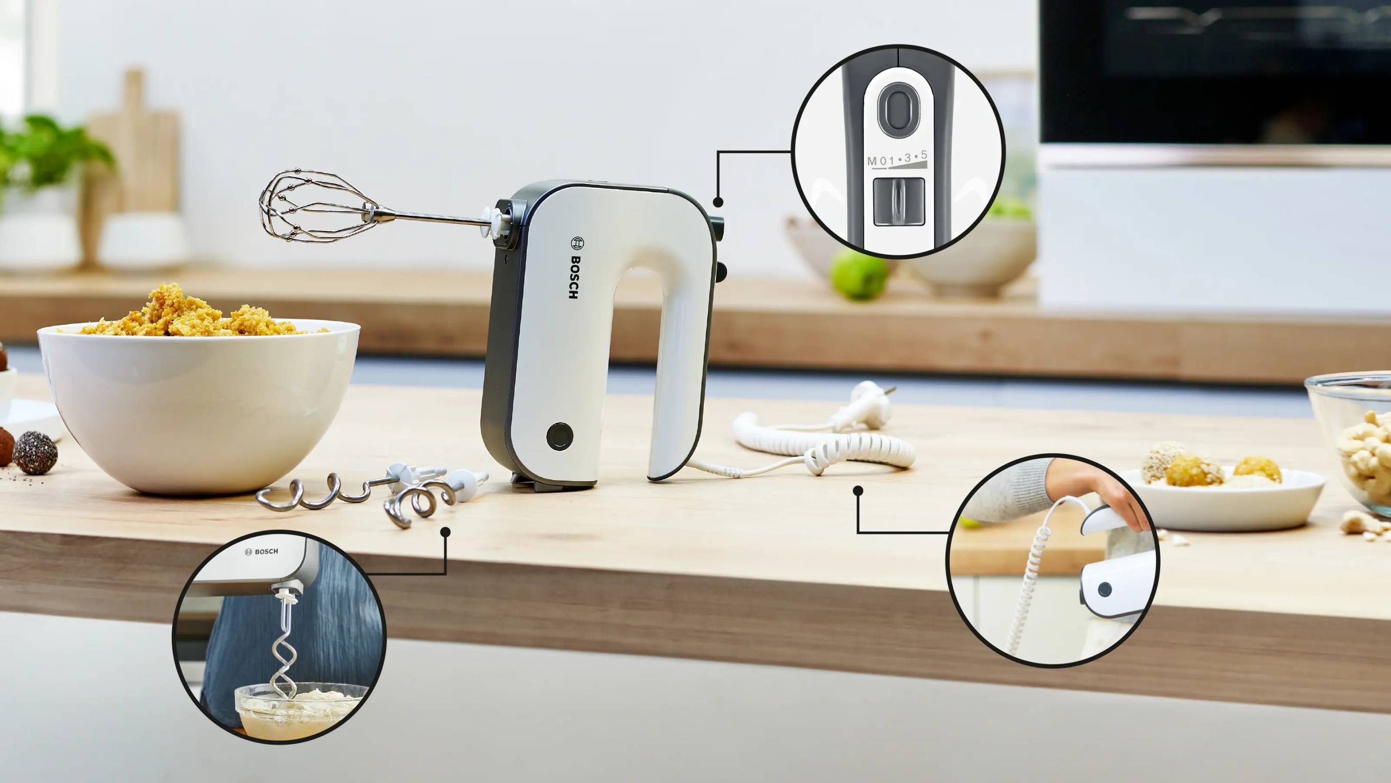 Ручной миксер Bosch MFQ49700 имеет компактные размеры 142×200×75 мм и вес 1,4 кг, что обеспечивает удобство использования и хранения. Корпус выполнен из прочного пластика, а ручка с покрытием SoftTouch обеспечивает комфортный и надежный захват. Цвет прибора — белый. Все пластиковые элементы, контактирующие с продуктами, не содержат BPA. Длина кабеля питания составляет 140 см, шнур спиральный, что предотвращает запутывание и делает работу удобной.