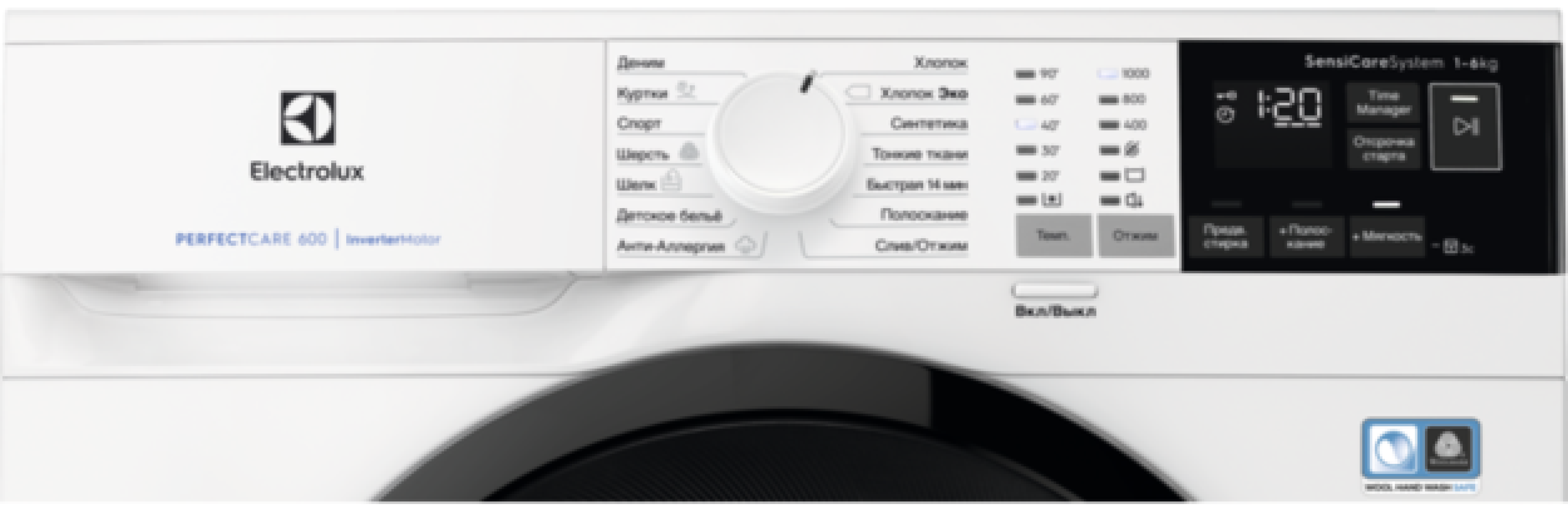 Система EcoTimeManager позволяет настраивать длительность стирки, гарантируя минимальное потребление энергии. Машина автоматически контролирует весь цикл стирки, обеспечивая эффективность и экономию.