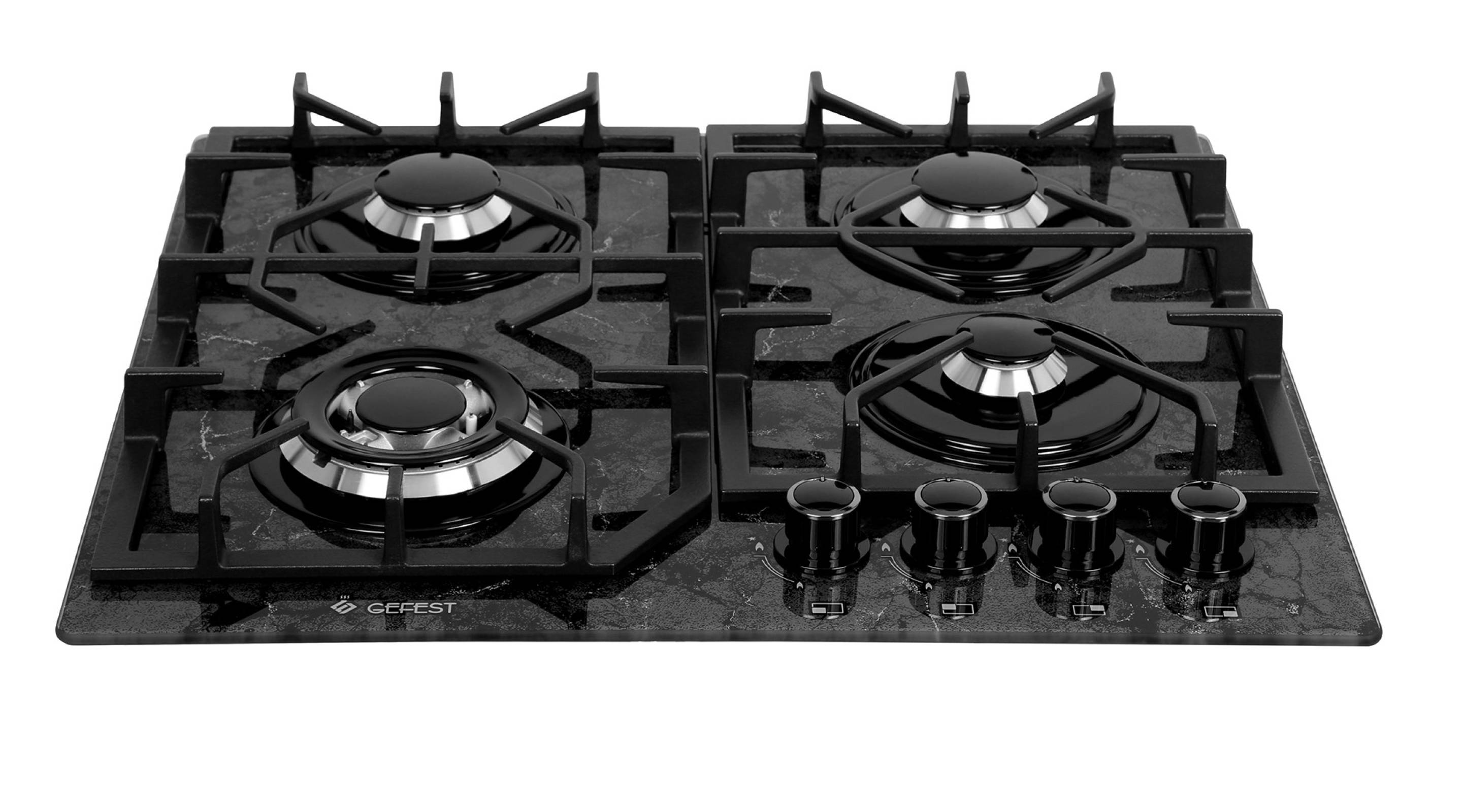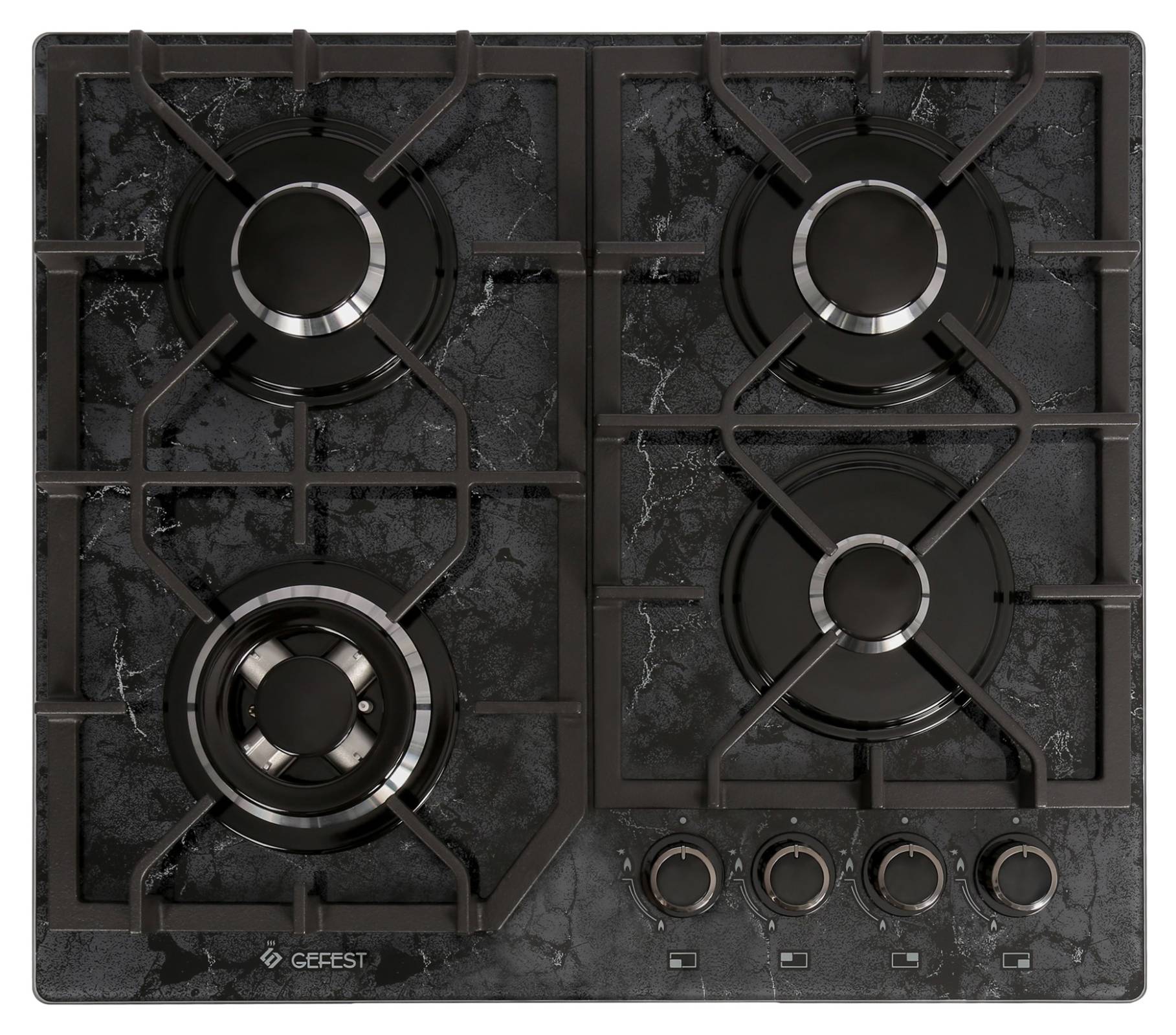 Благородный Дизайн: Варочная поверхность GEFEST PBG 2232-01 K53 представляет собой стильное сочетание черно-серебристой расцветки с элегантной имитацией мрамора, делая ее украшением любой кухни.