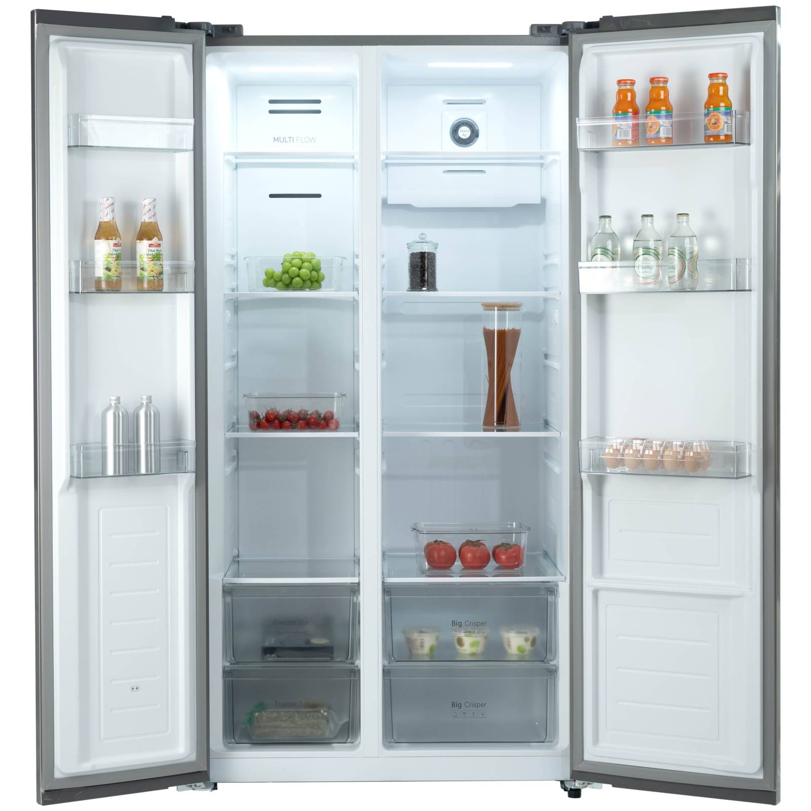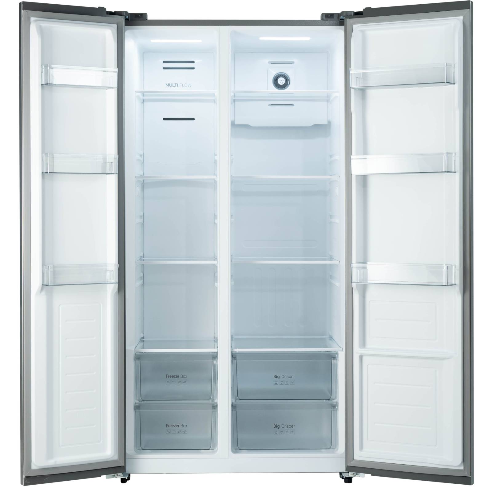 Side-by-Side холодильник Бирюса SBS 541 TBG (541 л) с дверьми из текстурированного чёрного стекла — элегантный и вместительный выбор для большой семьи: общий объём 541 л, Full No Frost в обеих камерах (без разморозки), Dual Inverter (инверторные компрессор и вентилятор для тишины и экономии энергии), система Multi Air Flow (равномерное распределение холода), деодорирующий фильтр Nano Ag+ (удаляет запахи и бактерии), зона свежести, электронное управление с LED-дисплеем, LED-освещение, режимы суперзаморозки/суперохлаждения.