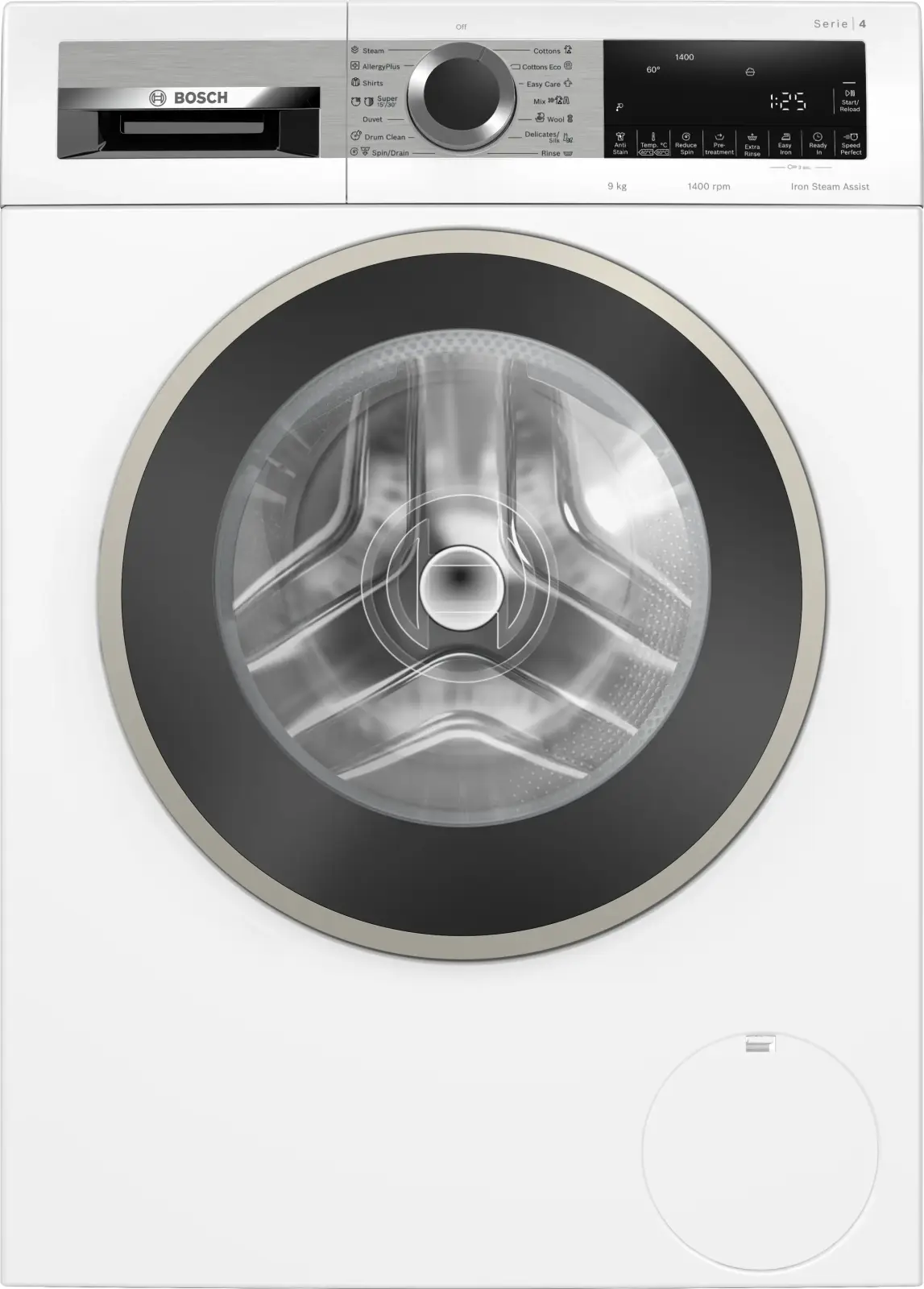 Фронтальная стиральная машина серии 4 с загрузкой 9 кг, инверторным двигателем EcoSilence Drive, отжимом 1400 об/мин, 14 программами стирки, белого цвета. Габариты 84,8 × 59,8 × 63,5 см, вес около 70 кг.