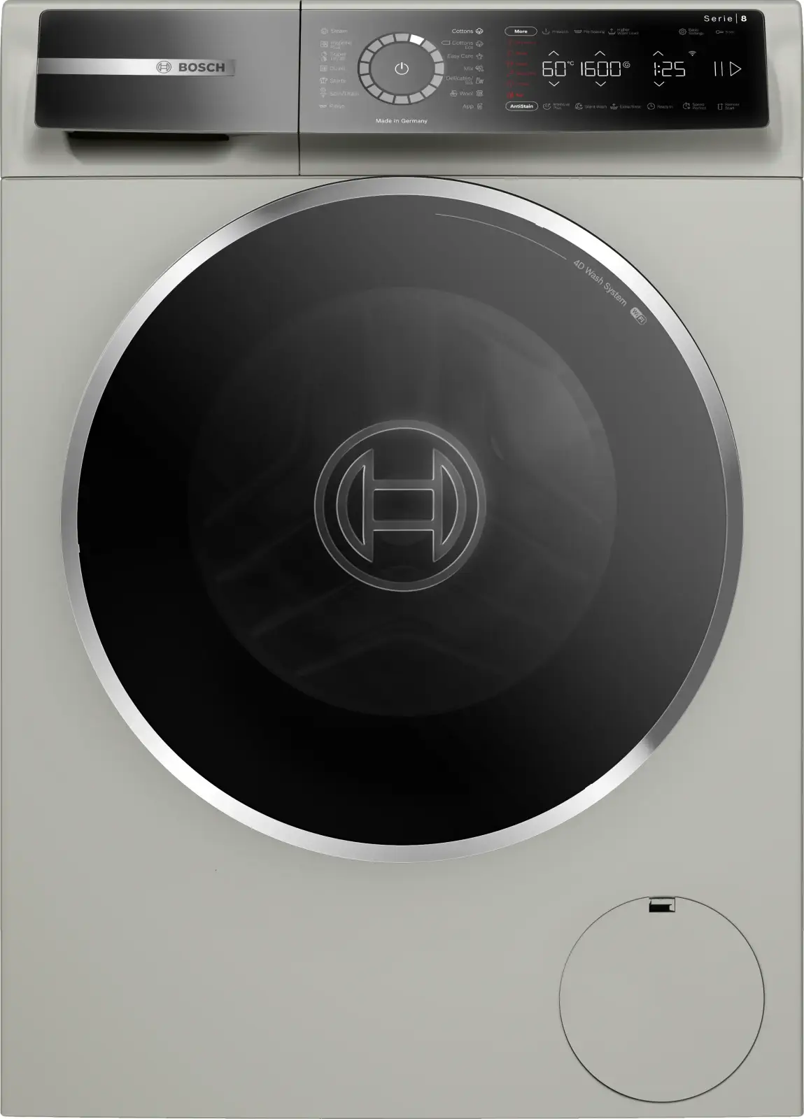 Фронтальная стиральная машина серии 8 с загрузкой 10 кг, инверторным двигателем EcoSilence Drive, отжимом 1600 об/мин, 13 программами стирки, цвет серебристый Silver Inox. Габариты 84,5 × 59,8 × 59–60 см, вес около 82,8 кг.